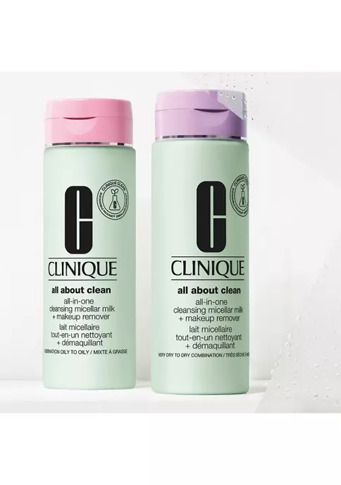 Creamy formula cleanses skin of pollution and impurities and removes face, lip, and eye makeup in one comforting yet refreshing stepβwithout disrupting skinβs natural moisture balance. Appropriate for sensitive eyes and contact lens wearers. Non-acnegenic. More oily skin? Try Clinique’s All-in-One Cleansing Micellar Milk + Makeup Remover Skin Types 3 & 4.