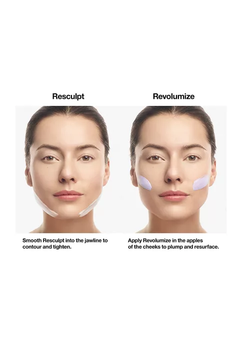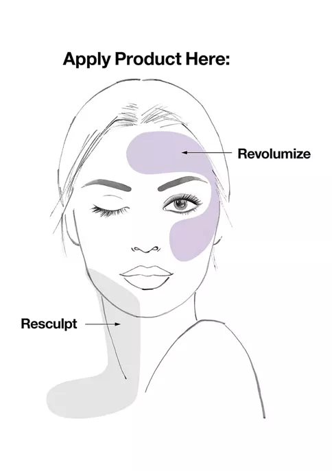 Apply Resculpt on the areas you’d like to contour and tighten, and Revolumize on those areas you’d like to replump and resurface.
