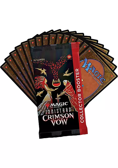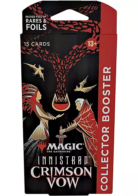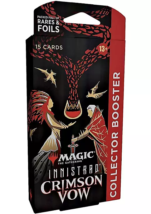 The Innistrad: Crimson Vow Collector Booster contains 15 Magic: The Gathering cards and 1 traditional foil double-sided token, with a combination of 5 Rares and/or Mythic Rares, 2รขโฌโ5 Uncommons, 4รขโฌโ7 Commons, and 1 Land card. Every pack includes a total of 10 traditional foil cards and a total of 8 cards with special treatmentsรขโฌโincluding Showcase, Borderless, and Extended-Art cards.