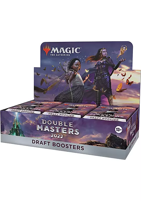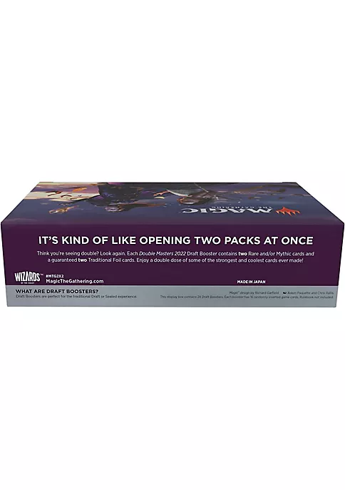 The Double Masters 2022 Draft Booster Box contains 24 Double Masters 2022 Draft Boosters. Each Draft Booster contains 16 Magic cards and 1 token/ad card, with a combination of 2รขโฌโ4 cards of rarity Rare or higher and 3รขโฌโ5 Uncommon, 8รขโฌโ10 Common, and 1 Land cards. Two cards of any rarity are Traditional Foil. Traditional Foil Borderless Mythic Rare Planeswalker in <1% of boosters.