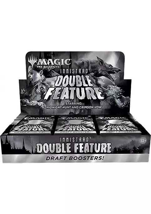 Factory sealed booster box containing 24 packs. Innistrad: Double Feature combines cards across both Innistrad: Midnight Hunt and Innistrad: Crimson Vow into a beautiful draft-ready booster to play and collect! Innistrad: Double Feature is available in displays of 24 Draft Boosters in English only, and each booster contains the following 15 cards: 4x Innistrad: Midnight Hunt commons 4x Innistrad: Crimson Vow commons 2x Innistrad: Midnight Hunt uncommons 2x Innistrad: Crimson Vow uncommons 1x Innistrad: Midnight Hunt rare or mythic rare 1x Innistrad: Crimson Vow rare or mythic rare 1x Silver screen foil card Each Draft Booster contains two non-foil double-faced cards, one from Innistrad: Midnight Hunt and one from Innistrad: Crimson Vow.