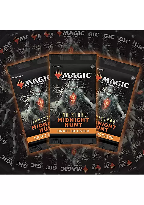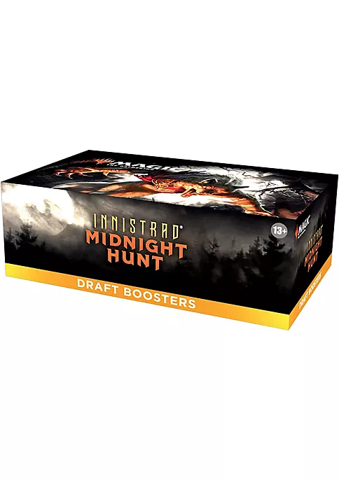 The Innistrad: Midnight Hunt Draft Booster Box contains 36 Innistrad: Midnight Hunt Draft Boosters (540 cards total). Each Draft Booster contains 15 Magic cards, 1 token or ad card, and 1 Helper card, with 1 Rare or Mythic Rare, 3 Uncommon, 10 Common, and 1 Eternal Night Full-Art Basic Land cards. A double- or single-faced traditional foil card of any rarity replaces a Common in 33% of Innistrad: Midnight Hunt Draft Boosters.