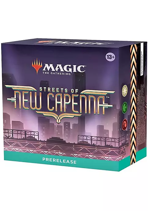 - 6 Streets of New Capenna Draft Boosters, 1 foil-stamped card from Streets of New Capenna of card rarity rare or higher, 1 deck box, 1 Spindown life counter, Join one of five powerful families and build your criminal empire