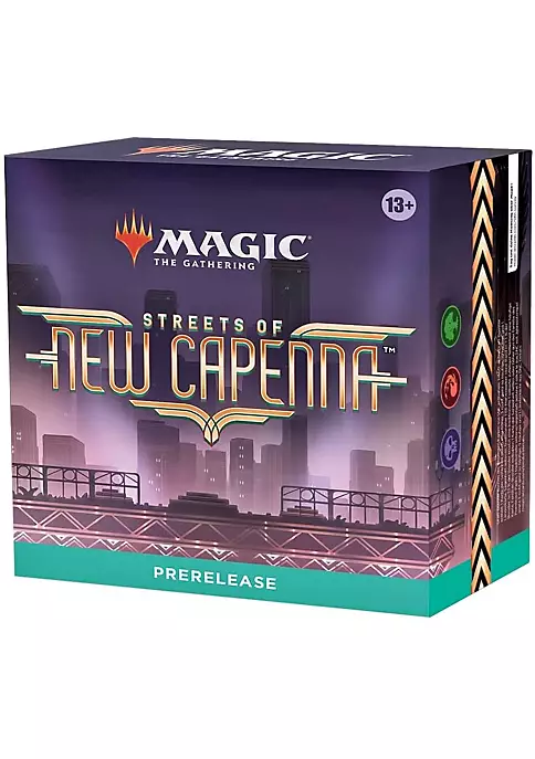6 Streets of New Capenna Draft Boosters, 1 foil-stamped card from Streets of New Capenna of card rarity rare or higher, 1 deck box, 1 Spindown life counter, Join one of five powerful families and build your criminal empire