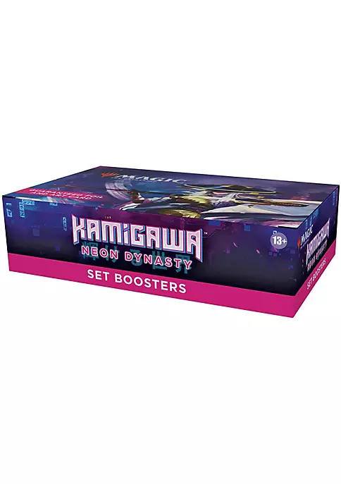 The Kamigawa: Neon Dynasty Set Booster Box contains 30 Kamigawa: Neon Dynasty Set Boosters. Each Set Booster contains 12 Magic cards, 1 Art Card, and 1 token, ad card, Helper card, or special card from Magic’s history (a card from “The List”). Each pack contains a combination of 1–4 cards of rarity Rare or higher, 2–7 Uncommons, 3–8 Common cards, and 1 Land card. One non–Art Card and non–Land card of any rarity is traditional foil, the Land card is traditional foil in 21% of packs, and a foil-stamped Signature Art Card replaces the Art Card in 5% of Set Boosters. A card from The List replaces the token or ad card in 25% of Set Boosters.